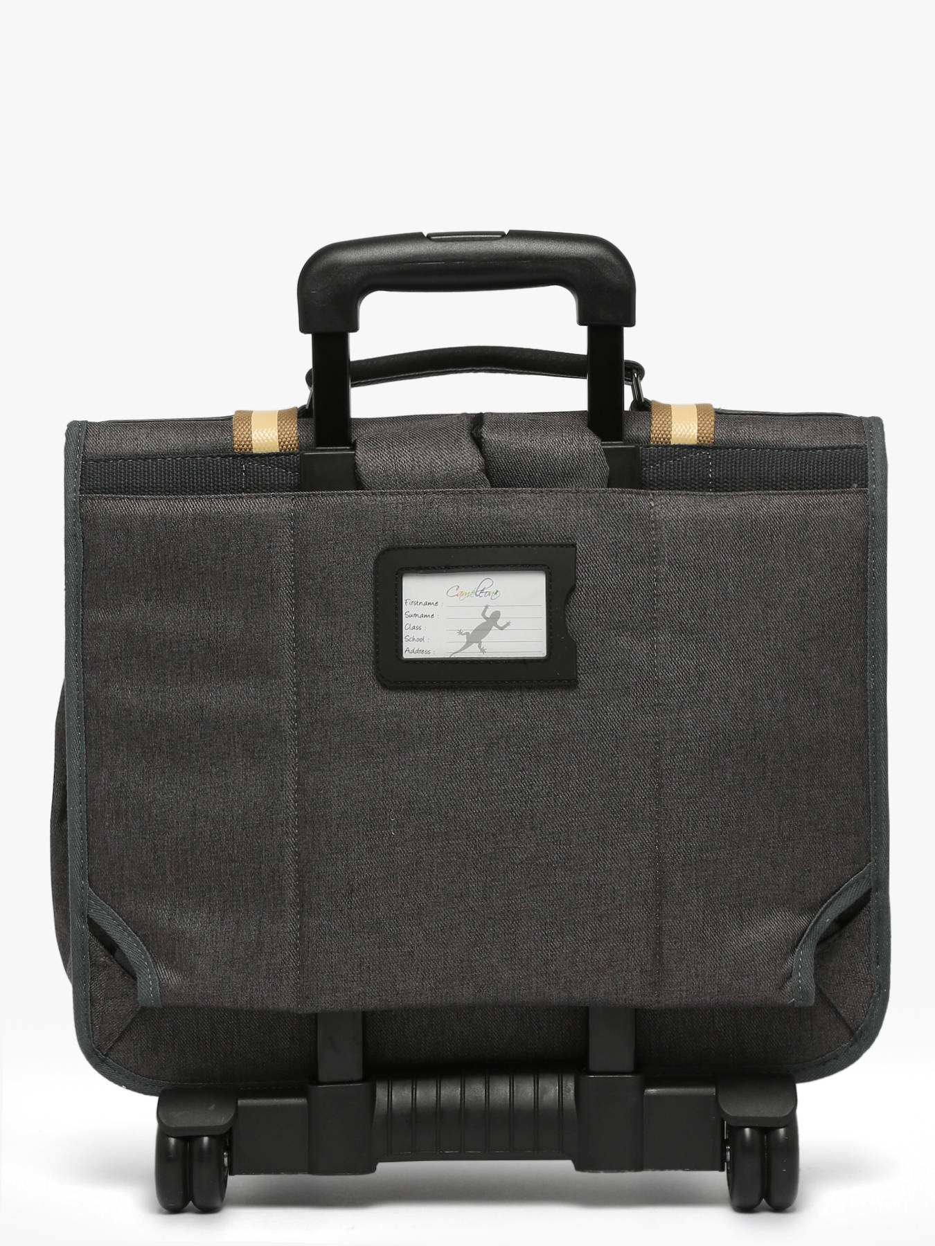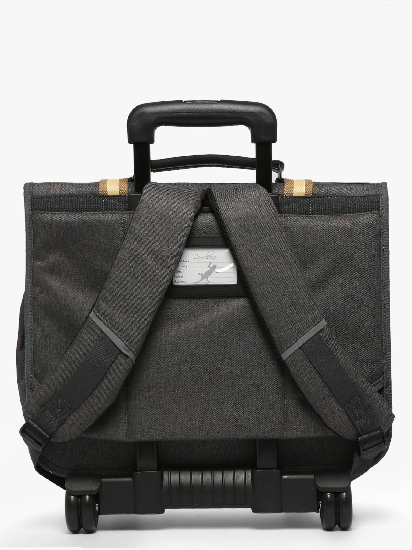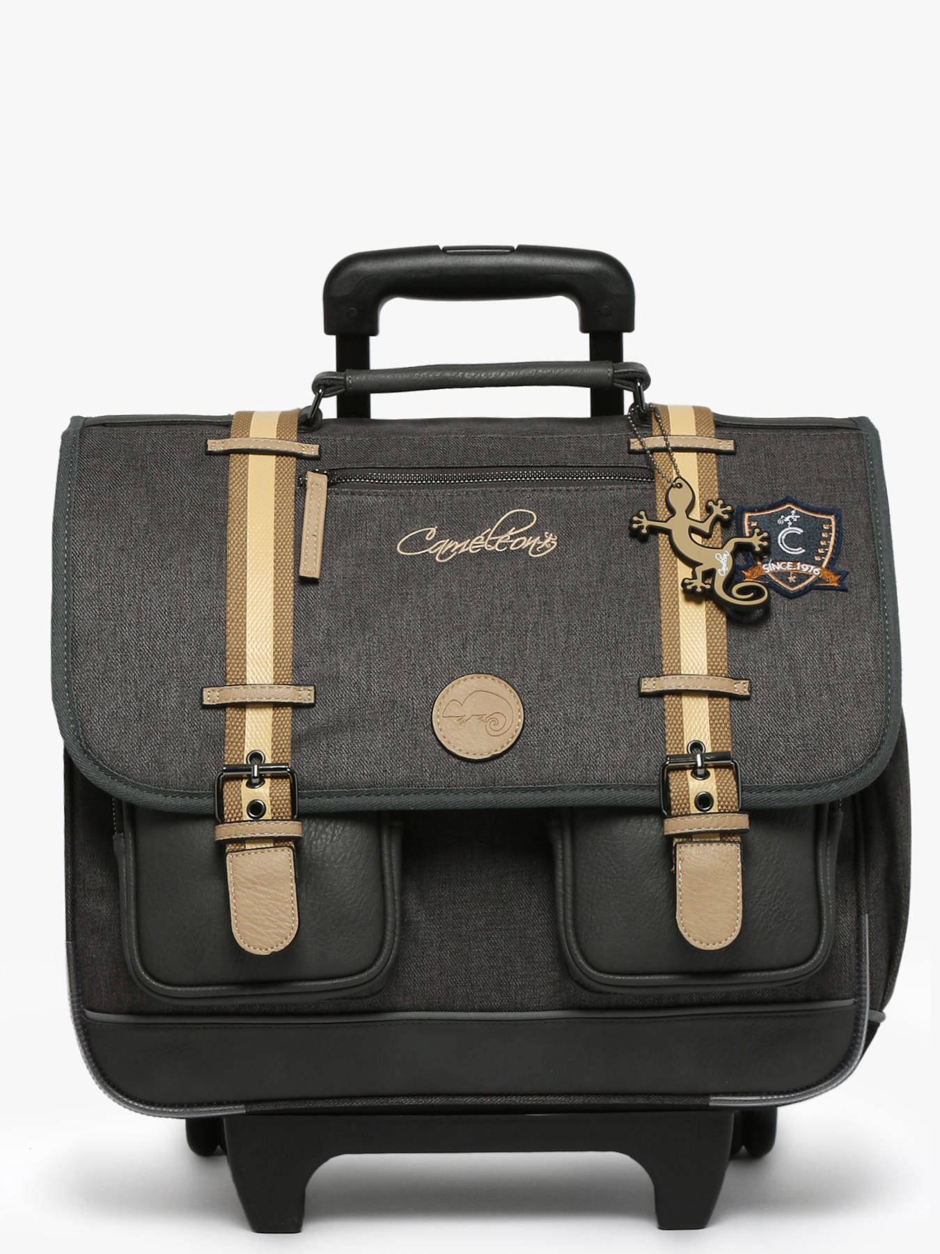 41 cm - 31 litres - 2.6 kg ~ Ce cartable à roulettes 3 compartiments 41cm de la ligne Vintage Urban de chez Caméléon est idéal pour le CM1 et le CM2. On aime ce cartable pour son grand espace, il se compose de trois compartiments permettant d’y glisser des cahiers ainsi que des classeurs allant jusqu’à 32x29x7cm. Il possède également une poche intérieure zippée. À l’extérieur, il se compose de deux poches à fermeture éclair sur le devant ainsi que d’un porte gourde latéral. Une bande réfléchissante est présente sur l’avant afin de garantir la sécurité de votre enfant. Son fond ainsi que ses côtés sont renforcés, permettant une utilisation quotidienne. Il est aussi possible de l'utiliser en sac à dos grâce aux bretelles déclipsables qui se trouvent dans la poche arrière du sac et à la protection rembourrée au niveau de l'armature des roues pour protéger le dos de votre enfant. Afin de garantir un confort optimal, les bretelles et le dos de ce cartable sont rembourrés. Petit plus, il dispose d’une étiquette nom, d’une règle offerte et de son porte-clé caméléon sur la poignée !