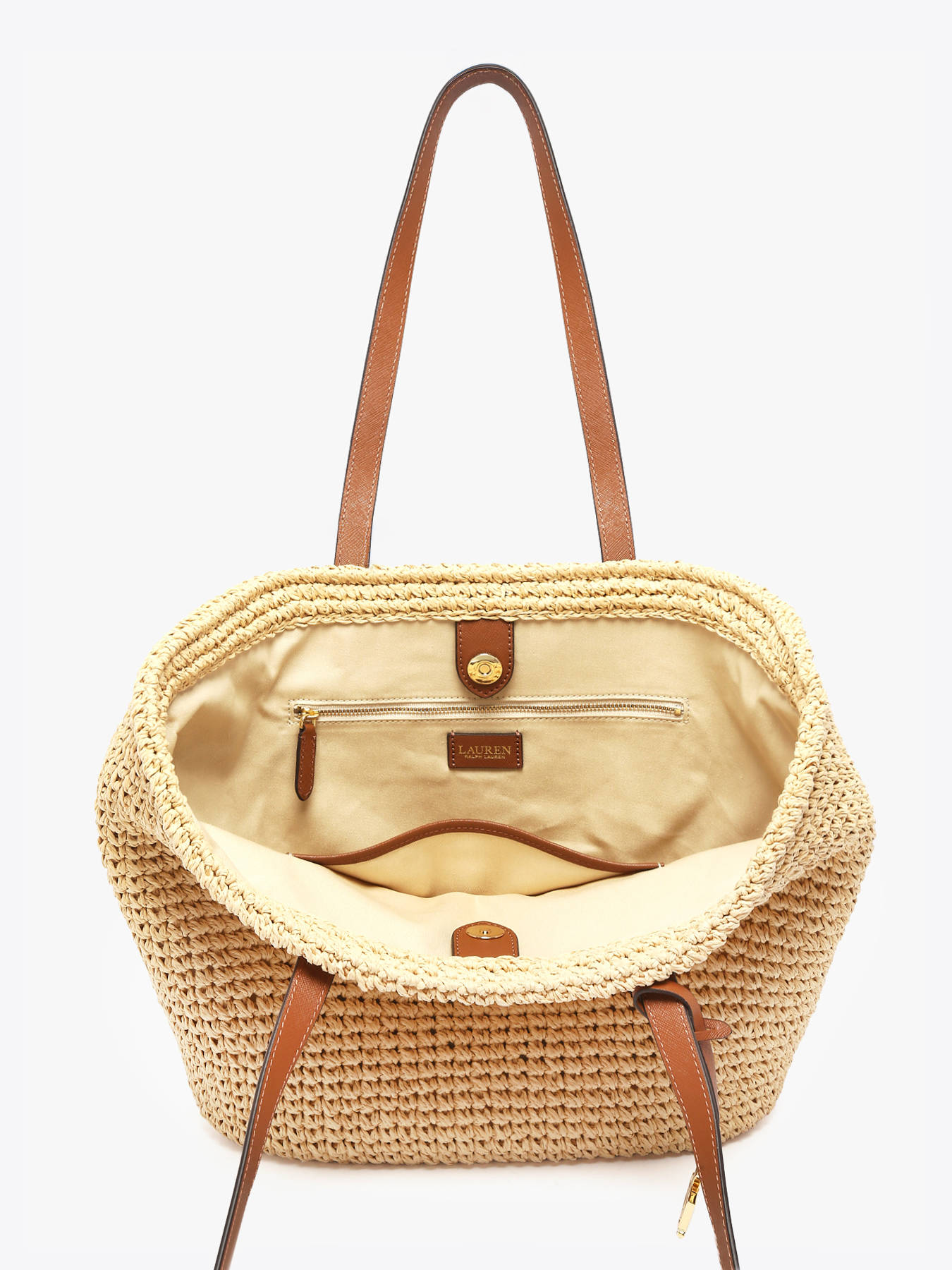 The Lainey shoulder bag by Lauren Ralph Lauren is made of raffia accented with leather details, combining natural elegance with sophistication. Its magnetic closure offers easy access to your belongings while ensuring security. With a 26 cm strap height, it comfortably fits over the shoulder, perfect for everyday use or a stylish outing. Inside, it features one simple pocket and one zippered pocket, ideal for organizing your essentials with style and practicality. This bag perfectly balances natural materials and modern design.