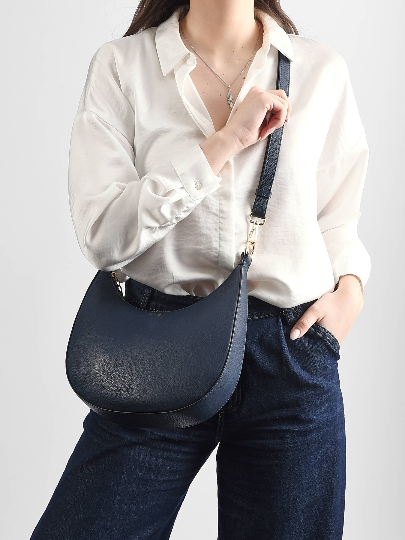 This new shape, from the emblematic TRADITION line by ETRIER, captivates with its half-moon design, offering generous storage space while retaining an elegant, modern look. Perfect for active women, this bag combines functionality and refinement. The gold jewels and stirrup on the zip evoke the distinctive codes of the TRADITION collection, adding a sophisticated touch to this timeless model. Inside, you'll find a single pocket and a zipped pocket for organising your essentials, while the medium size makes it easy to carry your everyday essentials. With its detachable, adjustable shoulder strap, this bag can be adapted to suit your every whim: worn over the shoulder for a casual look or cross-body for a more practical look. Its meticulous construction and minimalist design make it an essential choice for those looking for an elegant, spacious bag without compromising on style. The TRADITION half-moon shoulder bag by ETRIER is a stylish accessory for everyday use.